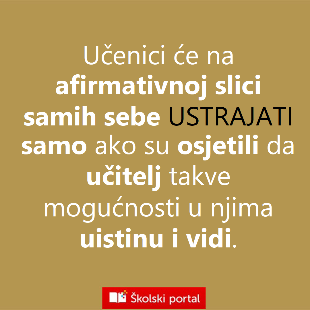 Evo još jednoga primjera. Zamislimo da vaši šestaši rade timski te su oduševljeni što će proučavati DNA. „Timovi čiji članovi dobro surađuju“, podsjećate ih, „najbolje će iskoristiti vrijeme koje im je na raspolaganju. Imate koju minutu za razgovor o tome kako ćete postići najbolju suradnju unutar tima.“ Postavili ste jasan afirmativan cilj prepoznajući ih kao moguće „suradnički učinkovite članove tima“, no oni će na toj afirmativnoj slici samih sebe ustrajati samo ako su osjetili da vi takve mogućnosti u njima uistinu i vidite.