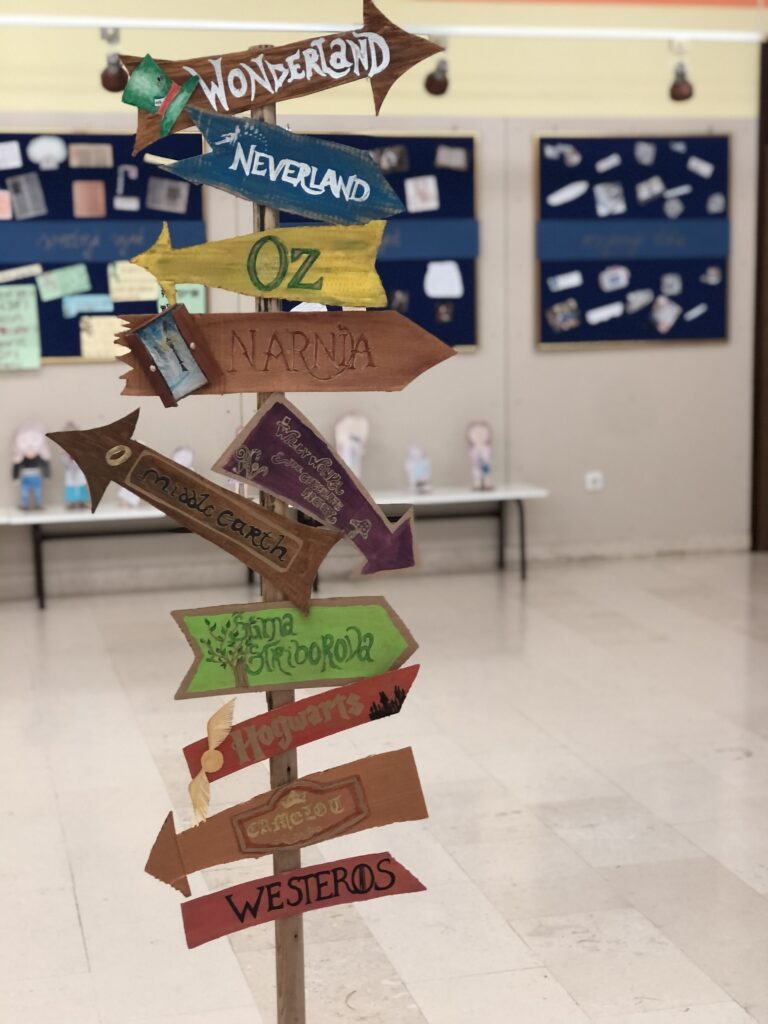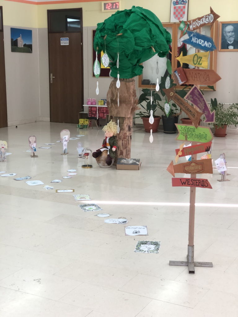 Mjesec hrvatske knjige traje od 15. listopada do 15. studenoga. U tom su razdoblju učenici sa svojim učiteljicama marljivo radili na svojim projektima. Kasnije su rezultate svoga rada predstavili velikom izložbom u atriju škole. Na samom početku izložbe postavljen je putokaz, putokaz koji vodi u zamišljene svjetove i koji nas može odvesti kamo god poželimo – u Narniju, Hogwards, Međuzemlje, Zemlju Čuda ili, pak, u tvornicu čokolade. Stazicom Huckleberry Fina dolazimo do središnjeg dijela izložbe – Malog princa koji sjedi ispod stabla čuvajući svoju ružu. S krošnje visi lišće i ogledalca, a oko stabla sjede djevojčice koje čitaju svoje knjige. Malo dalje je Hlapić smjestio svoju radionicu, a i kuga je upravo otvorila Instagram profil.