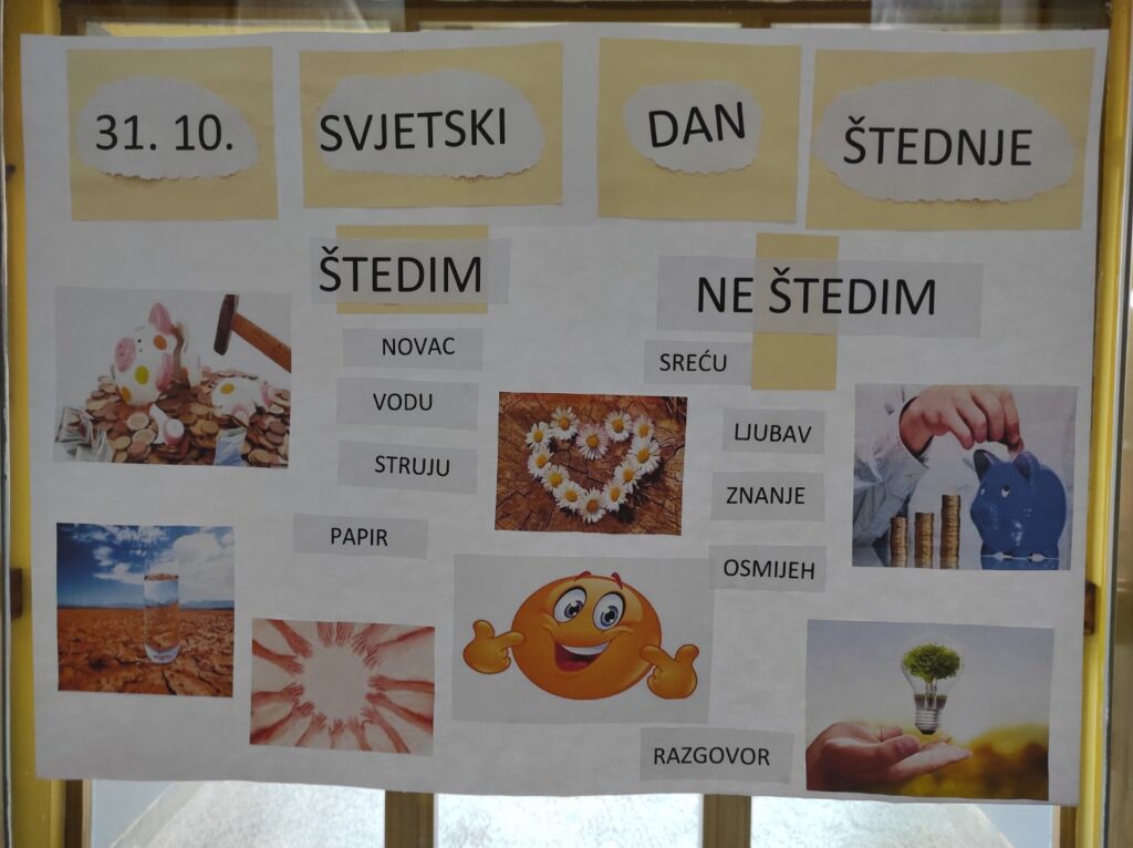 Raznim su aktivnostima osvijestili spoznaju da za novac, koji se pojavljuje u bankomatima, ljudi moraju dugo i puno raditi. Iako im je jedini novac kojim raspolažu džeparac, učenici su se uoči Svjetskog dan štednje, koji se obilježava 31. listopada, podsjetili na važnost stvaranja štednih navika. Ovaj je važan datum podsjetnik na Prvi međunarodni kongres štedioničara koji je održan davne 1924. godine u Milanu. Tada su se sastali predstavnici svjetskih štednih ustanova želeći pronaći izlaz iz krize koju je prouzrokovao Prvi svjetski rat. Sudionici toga kongresa usuglasili su se da je štednja prijeko potrebna za razvoj čovječanstva pa je ustanovljen Svjetski dan štednje kao oživljavanje borbe protiv rasipništva.