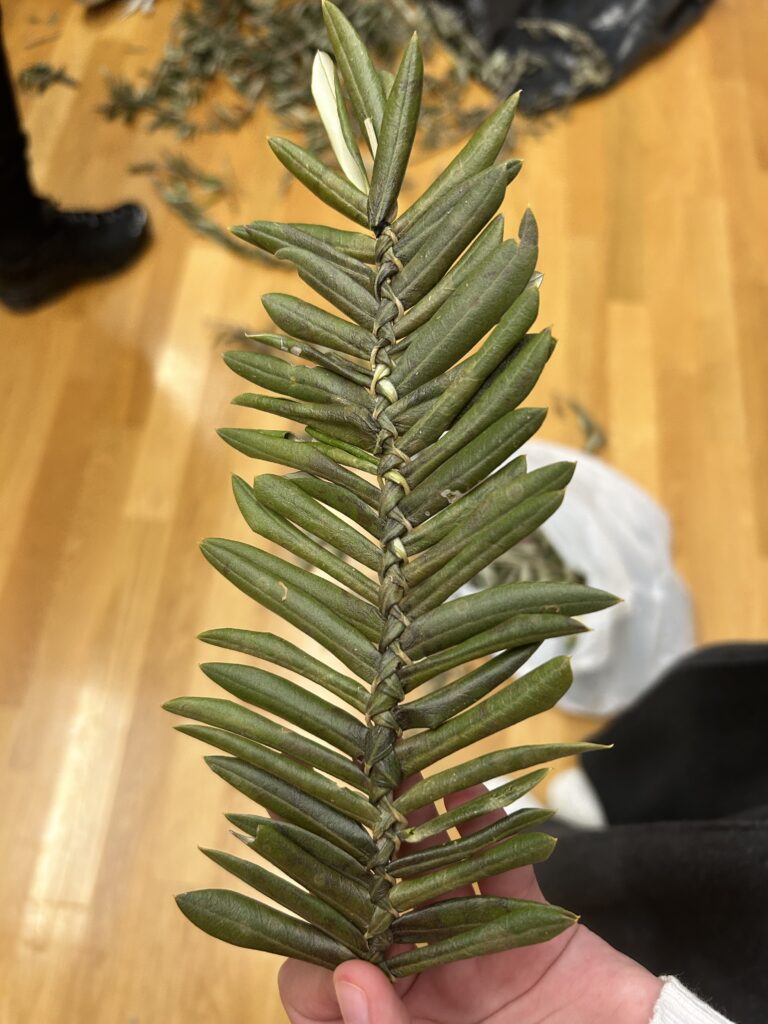 Dan smo ranije ubrali maslinove grane u našem školskom vrtu i pripremili smo ih za pletenje. Mama naše učenice Sare Lidija STOJANOVIĆ ljubazno se ponudila da svoje znanje pletenja maslinovih grančica prenese i na učenike, učiteljicu Jadranku i knjižničarku Mariju.