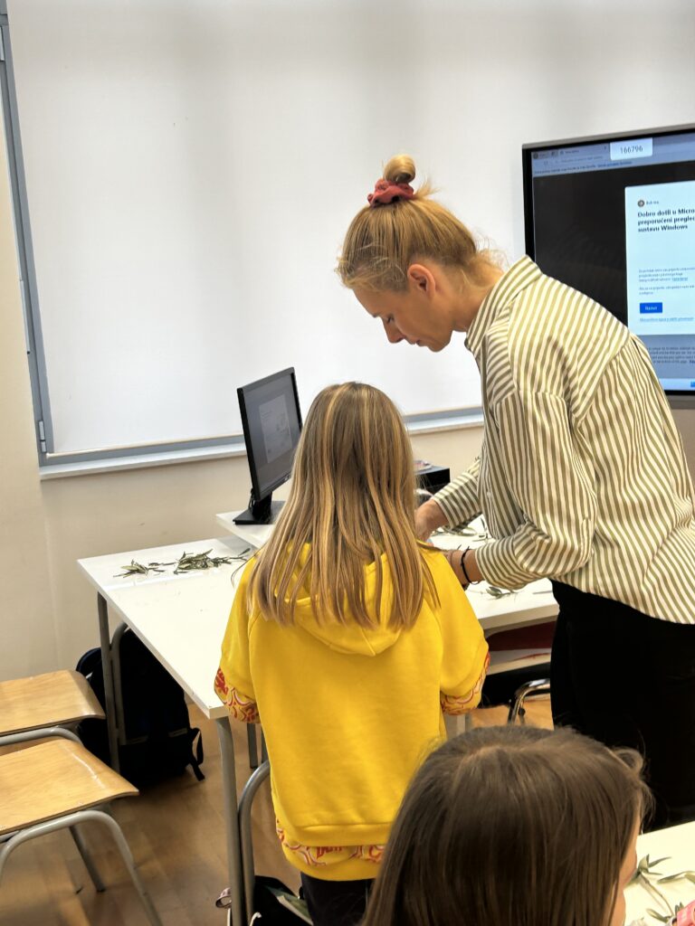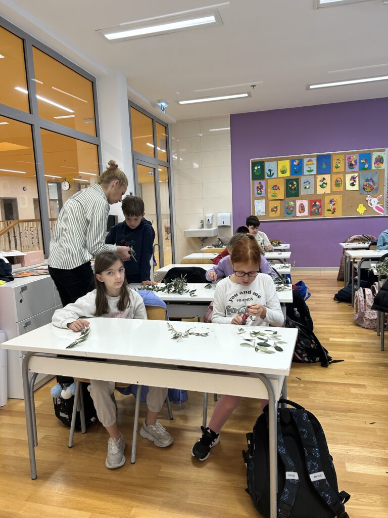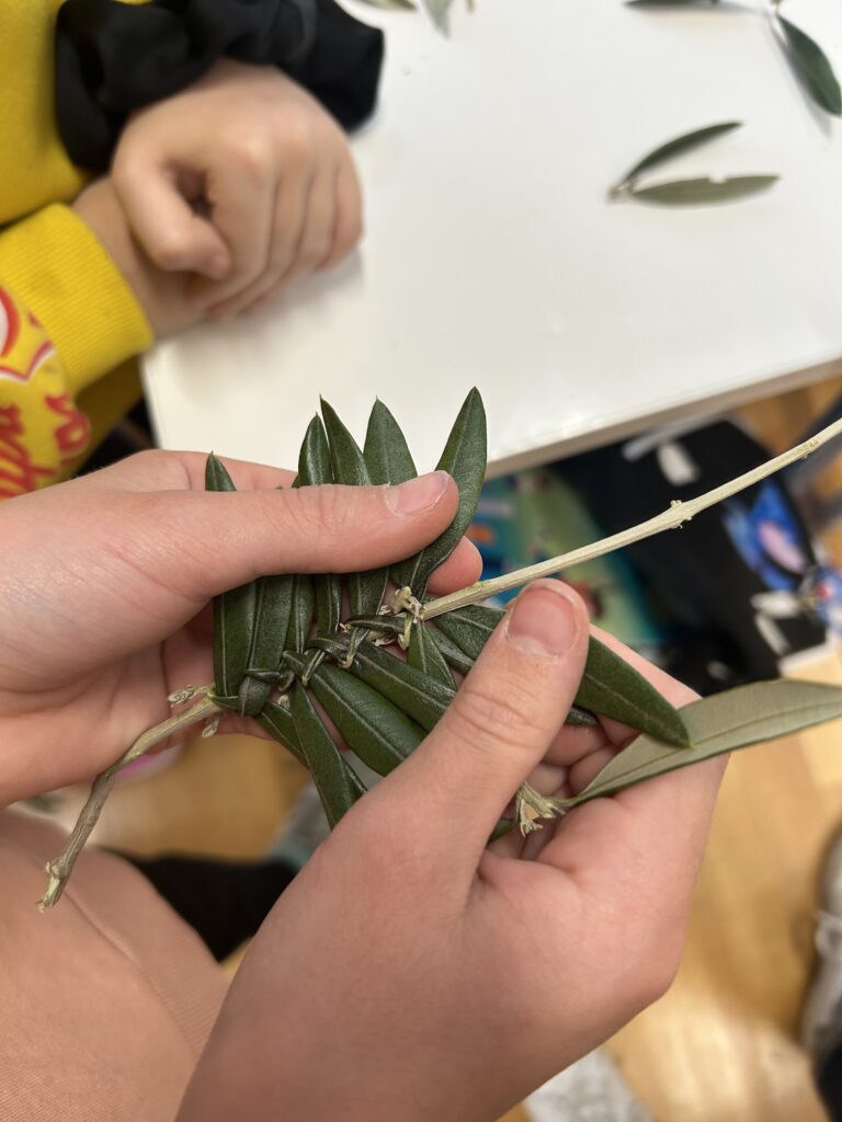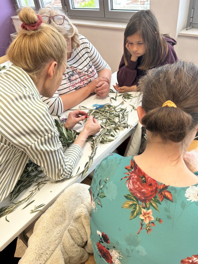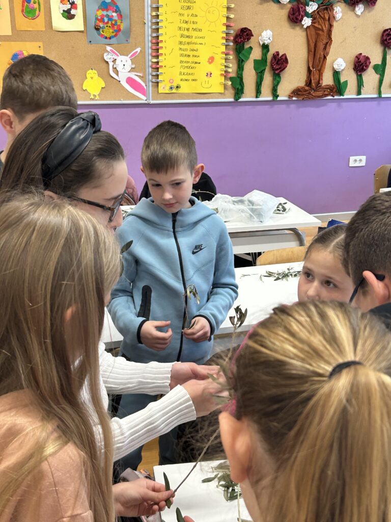 U toploj smo se i ugodnoj atmosferi učionice svi okupili oko klupa spremni za učenje. Mama je Lidija strpljivo pokazivala kako savijati maslinove grančice. U početku nam nije bilo lako, grančice su bile žilave, a naši prsti nespretni.