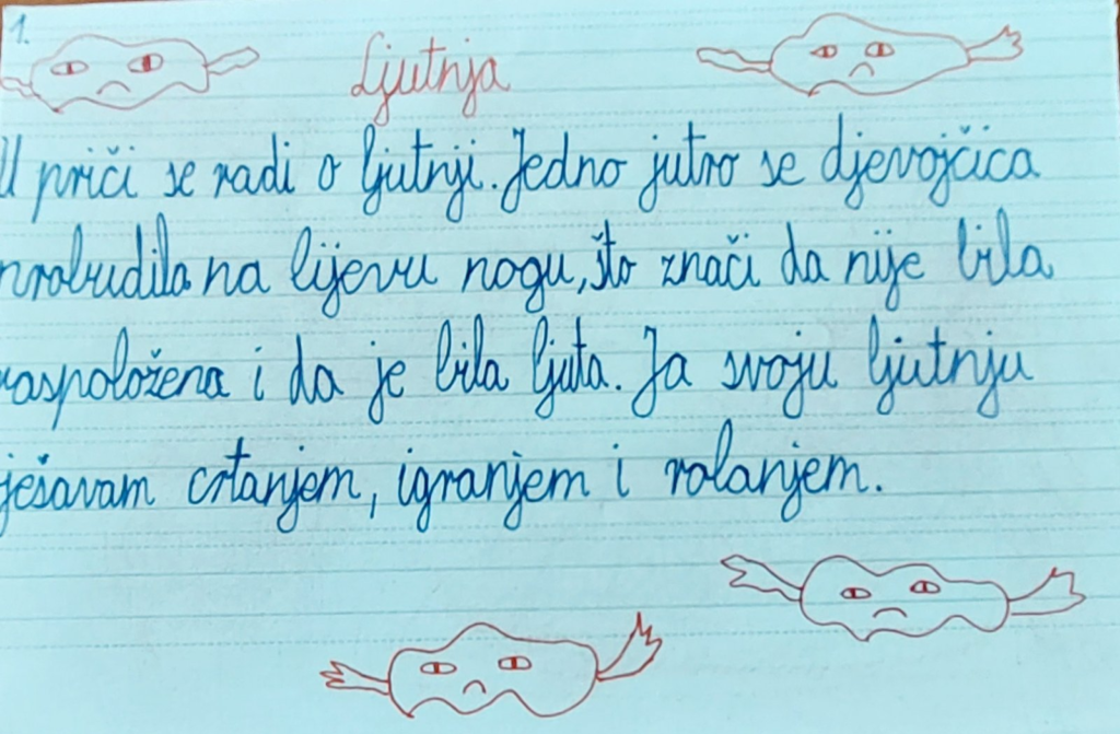 Posudili smo knjigu u našoj školskoj knjižnici i pročitali uvodnu priču „O pisanju priča i sisanju palca”. Slijedila je analiza priče.