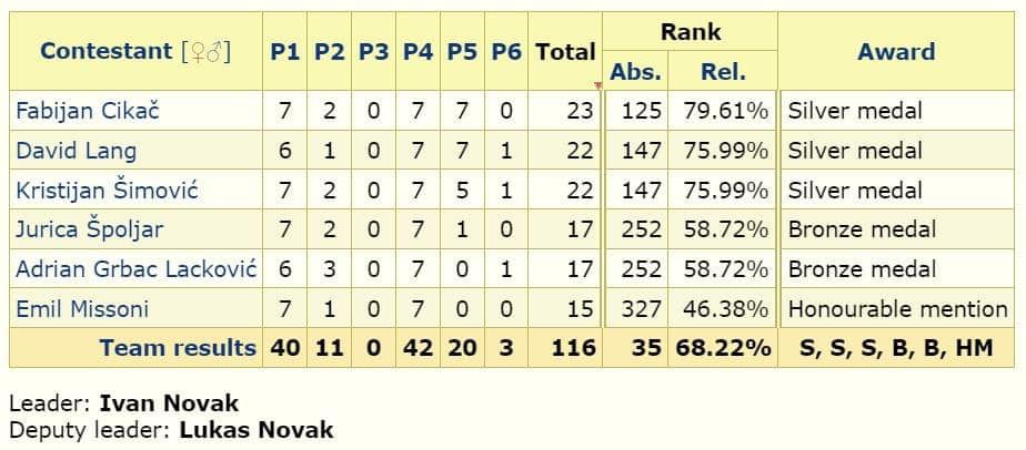 Hrvatsku su na natjecanju predstavljali Kristijan Šimović, David Lang, Adrian Grbac Lacković, Jurica Špoljar, Fabijan Cikač i Emil Missoni, svi učenici XV. gimnazije u Zagrebu. Voditelji ekipe su bili Ivan Novak i Lukas Novak, asistenti na Matematičkom odsjeku zagrebačkog Prirodoslovno-matematičkog fakulteta.
