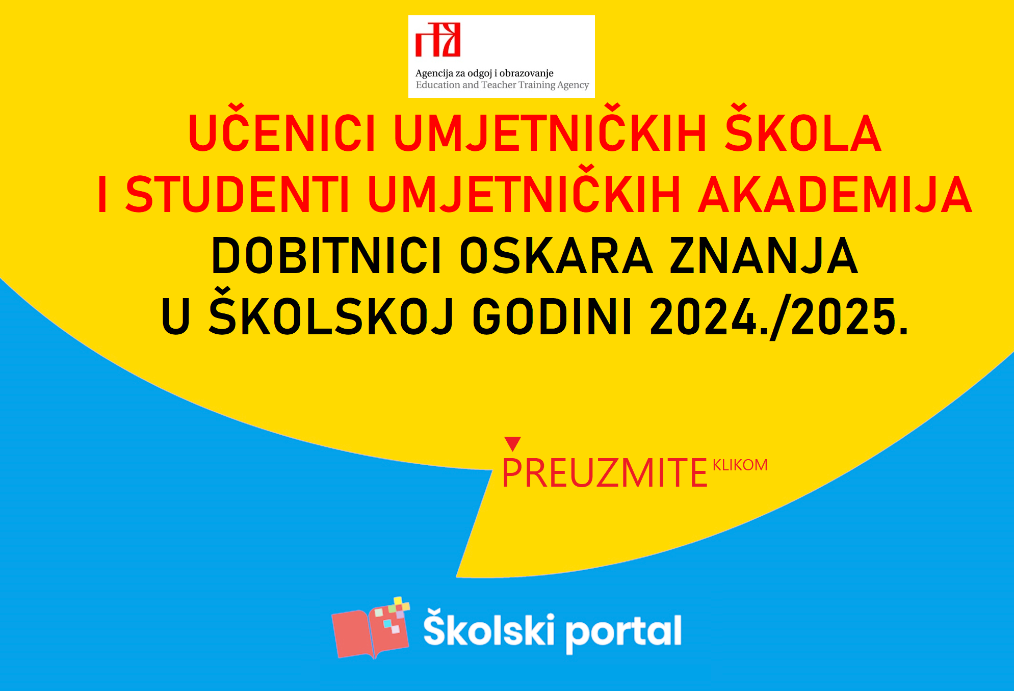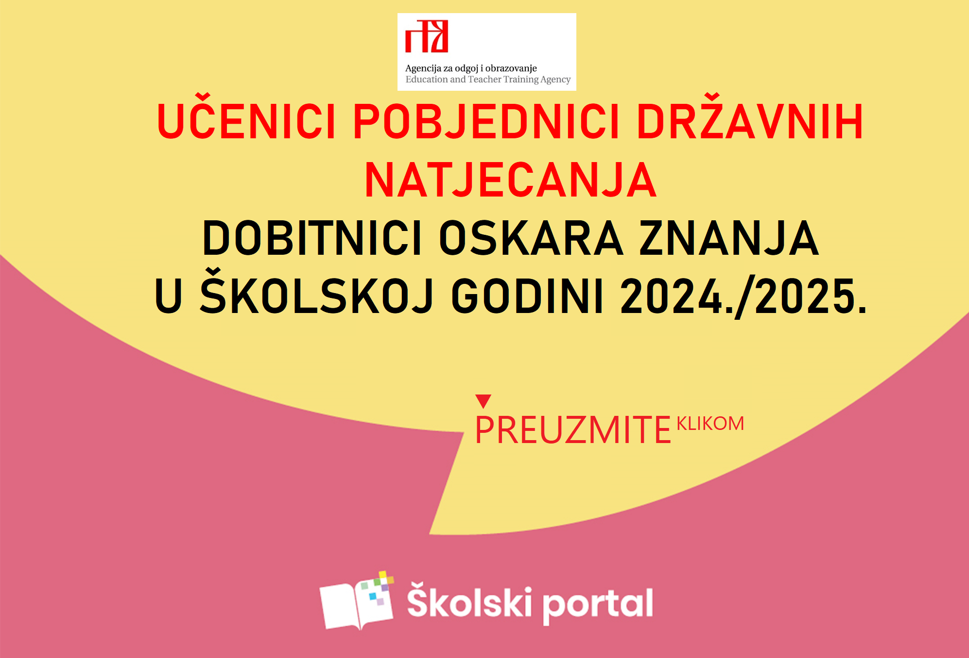 Nagradu Oskar znanja, skulpturu autora, slikara i dizajnera Ivice PROPADALA i Priznanje, u školskoj godini 2024./2025. primilo je 462 učenika, čija imena objavljujemo. Zahvalnica za predan i stručan radprimili su i mentori nagrađenih učenika jer su svojim iznimnim znanjima i trajnom posvećenošću doprinijeli ostvarivanju iznimnih postignuća učenika.