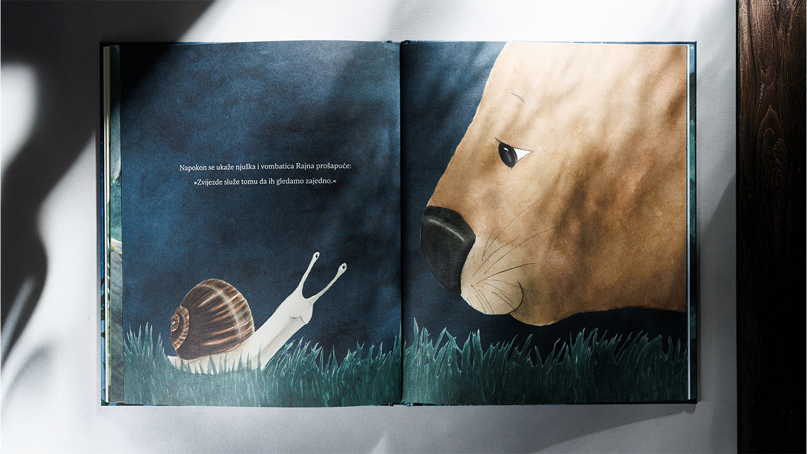 Kad padne noć, puž Luka kreće u istraživanje svijeta. Mjesec mu osvjetljava put, lišće mu pruža skrovište, a kiša šapće svoje tihe pjesme. Ipak, jedno ga pitanje ne napušta: Čemu služe zvijezde? U potrazi za odgovorom Luka susreće pčelu, pticu, tobolčara… Svaki susret donosi novu misao, a pravi odgovor dolazi tek kad upozna vombaticu Rajnu. Što ako zvijezde nisu samo daleka svjetla na nebu, nego priča koju otkrivamo zajedno?