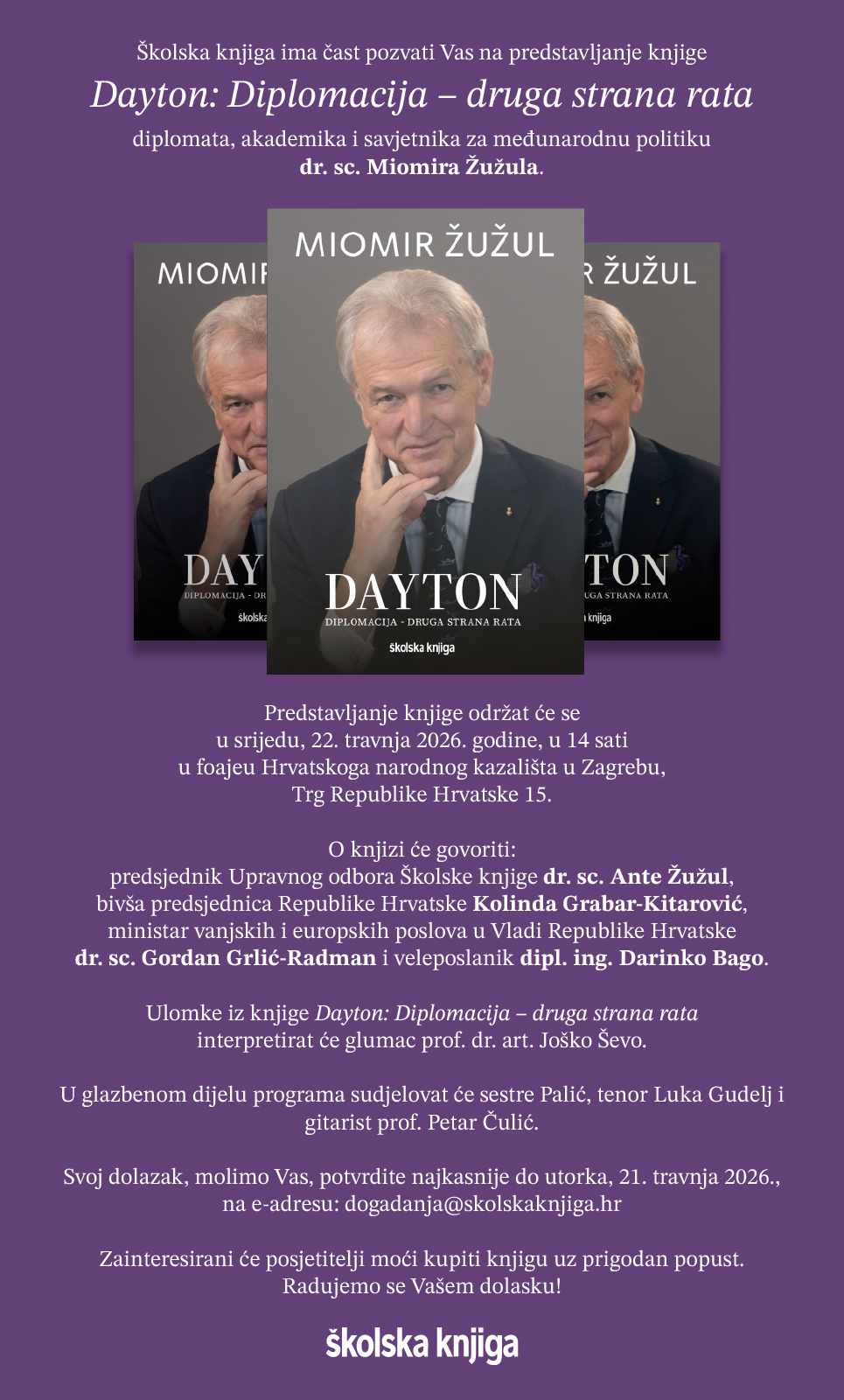 Predstavljanje nove knjige u izdanju Školske knjige, koju je napisao jedan od glavnih sudionika daytonskog procesa, održat će se u srijedu, 22. travnja, u foajeu Hrvatskoga narodnog kazališta u Zagrebu