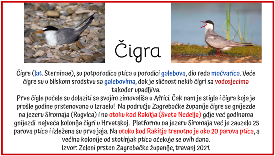 Čigra je ptica selica koja je prepoznatljiva po svom crvenom kljunu i crvenim nogama koje na dnu imaju kožice. Na našu sreću svoje stanište ima na jezerima uz Savu, u našem zavičaju. Izuzetno je lijepa izgledom, podsjeća na galeba (učenički opis), a zbog svog je crvenog kljuna drukčija i posebno lijepa.
