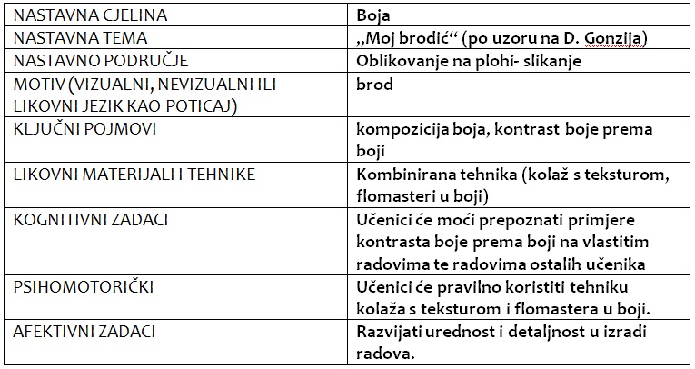 Na ovom satu Likovne kulture smo se upoznali s slikarskim rukopisom hrvatskog slikara Domenico GONZIJA. Posebnu pažnju smo obratili na brodove koje je izrađivao spomenuti umjetnik. Nakon toga smo izradili vlastite brodiće kombiniranom tehnikom (kolaž s teksturom i flomaster u boji).