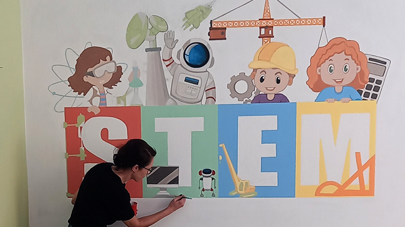 Svi već znamo da se STEM pristup obrazovanju temelji na kombinaciji različitih područja: prirodnih znanosti, tehnologije, inženjerstva i matematike. Ta pomalo apstraktna akademska disciplina na našem je novom muralu dobila ljudska obilježja kako bismo ju što uspješnije približili uzrastu učenika. U toj je priči najvažniji način učenja tih područja, a STEM pristup zapravo znači interdisciplinarno učenje, odnosno izbjegavanje učenja svakog predmeta za sebe.