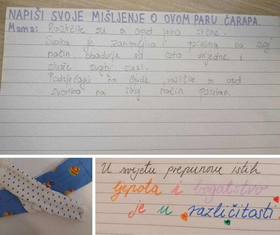 Uoči obilježavanja Svjetskog dana osoba s Downovim sindromom učenici imaju zadatak staviti pred roditelje par različitih čarapa i list papira na kojemu će napisati koja se poruka, prema njihovu mišljenju, šalje nošenjem rasparenih čarapa. Na sam Svjetski dan osoba s Downovim sindromom učenici dolaze u školu s rasparenim čarapama i donose sa sobom listove papira na koje su njihovi roditelji napisali vlastite misli. Na satu čitamo i komentiramo razmišljanja roditelja, razgovaramo i zajedno donosimo zaključak o tome da su različitosti sastavni dio naših života te da ih trebamo prihvatiti, prigrliti i ravnopravno živjeti s njima.