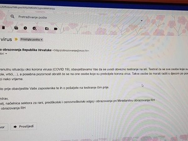Ministarstvo znanosti i obrazovanja objavilo je upozorenje zbog širenja fotografije lažnog e-mail sadržaja u kojem se navodi kako je uvedeno obavezno testiranje na koronavirus za sve zaposlene u o