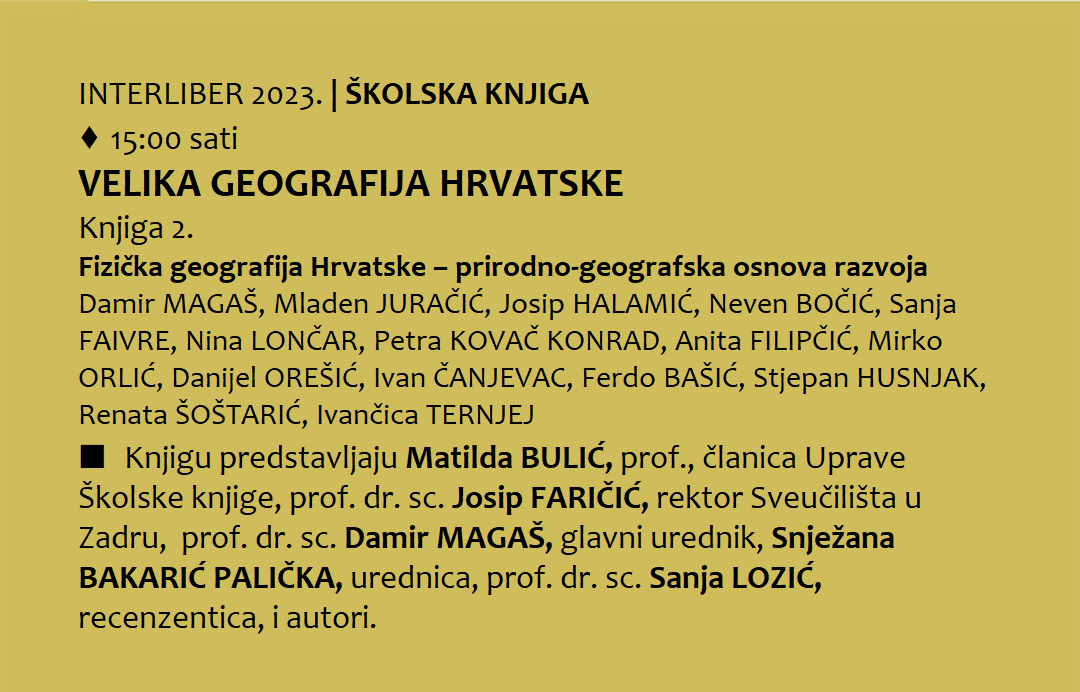 To vrijedno djelo objavljeno u suizdanju Sveučilišta u Zadru i Školske knjige donosi temeljne činjenice o prirodno–zemljopisnim sastavnicama Hrvatske koje će osobito zanimati struku, ali i znanstvenike, prostorne planere, političare, gospodarstvenike i studente