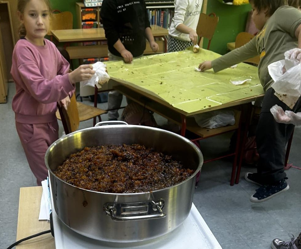 Nakon pranja i vađenja koštica djeca su promatrala kako se šljive strojno melju. Bilo je puno smijeha i uzbuđenja dok su se plodovi pretvarali u kašu. Započeo je i proces kuhanja u velikom kotlu. Miris šljiva brzo se širio školskim hodnicima, a djeca su radoznalo pitala: „Kad će biti gotovo?“