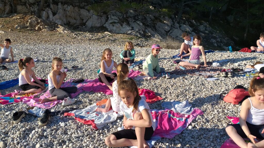 Pješačili smo dva kilometra do cilja, plaže okružene liticama, iz kojih se nakon kiša slijeva vodopad. Po dolasku smo doručkovali. Vodopada nije bilo jer u zadnje vrijeme nije padala kiša. Na plaži su učenici prostrli ručnike i slušali priču autora Milana Taritaša Gdje izvire potok.