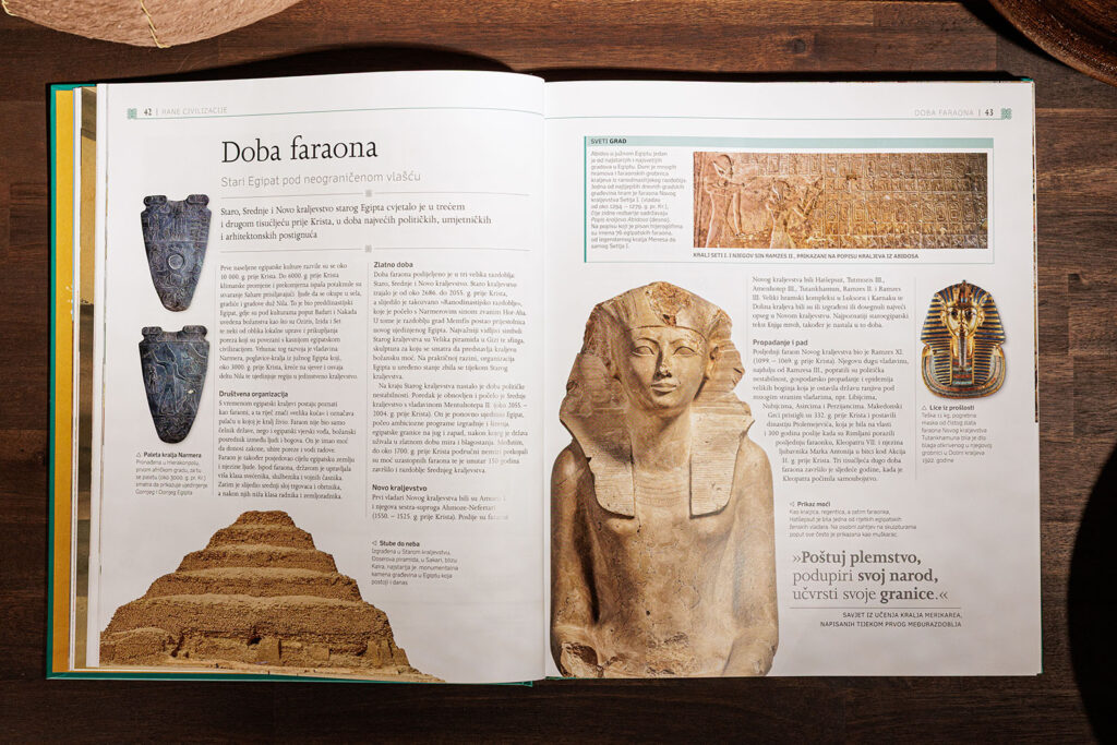 Nova izdanja u zapaženome znanstveno-popularnom serijalu Velika ilustrirana povijest, kojemu pripadaju i knjige Drevni Egipat, Carska Kina i Stari Rim, sadržavaju mnogobrojne fotografije, crteže i digitalne rekonstrukcije koje čitatelje ostavljaju bez daha