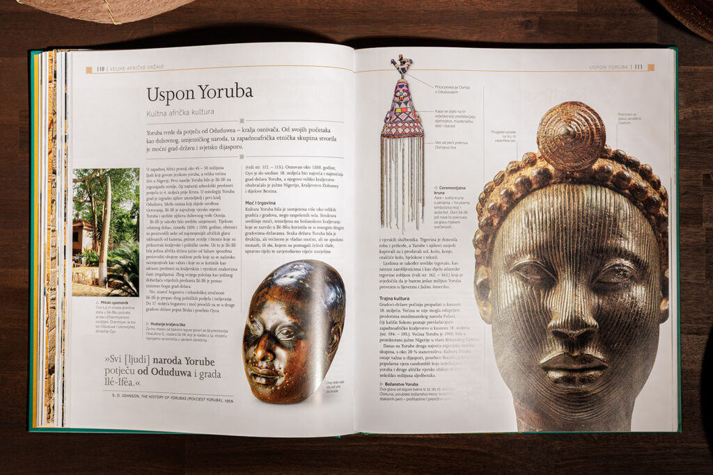 Upoznat ćete neke od najvažnijih afričkih političkih i vojnih vođa uključujući Hanibala, Mansu Musu, Obu Ewuarea, kraljicu Nzingu, Kwamea Nkrumaha, Nelsona Mandelu i Ellen Johnson Sirleaf. Izvrsne fotografije prikazuju veličanstvenu umjetnost i arhitekturu koju su stvorile afričke civilizacije, a izvrsne digitalne ilustracije rekonstruiraju znamenite građevine i svakodnevni život u izgubljenim gradovima poput Timbuktua i Velikog Zimbabvea.