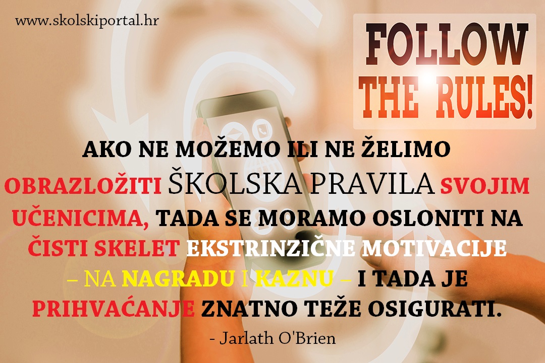 Snažno vjerujem u obrazloženost pravilâ koja vrijede za naše učenike. Jednostavno, nisam jedan od onih kojima je dovoljno osloniti se na autoritet položaja kakav imam. Ako ne možemo ili ne želimo opravdati školska pravila svojim učenicima, tada se moramo osloniti na čisti skelet ekstrinzične motivacije – na princip nagrade i kazne – i tada je prihvaćanje znatno teže osigurati.
