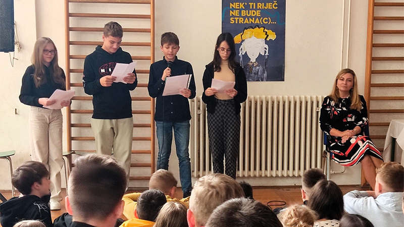 Willkommen, mein Freund. Ist die Begrüßung, mit der wir liebe Gäste in unserer Region empfangen. Zu Beginn dieses Treffens grüßen wir Sie alle herzlich, und es ist uns eine besondere Ehre, unsere Gastgeberin zu begrüßen und ihr einen angenehmen, schönen und freudigen Aufenthalt in unserer Schule zu wünschen. Dies war einst auch ihre Schule. In dieser Schule hat sie ihre Grundschulausbildung abgeschlossen. Bei uns ist Frau Lucija Raković, geborene Radak, eine professionelle Übersetzerin.“